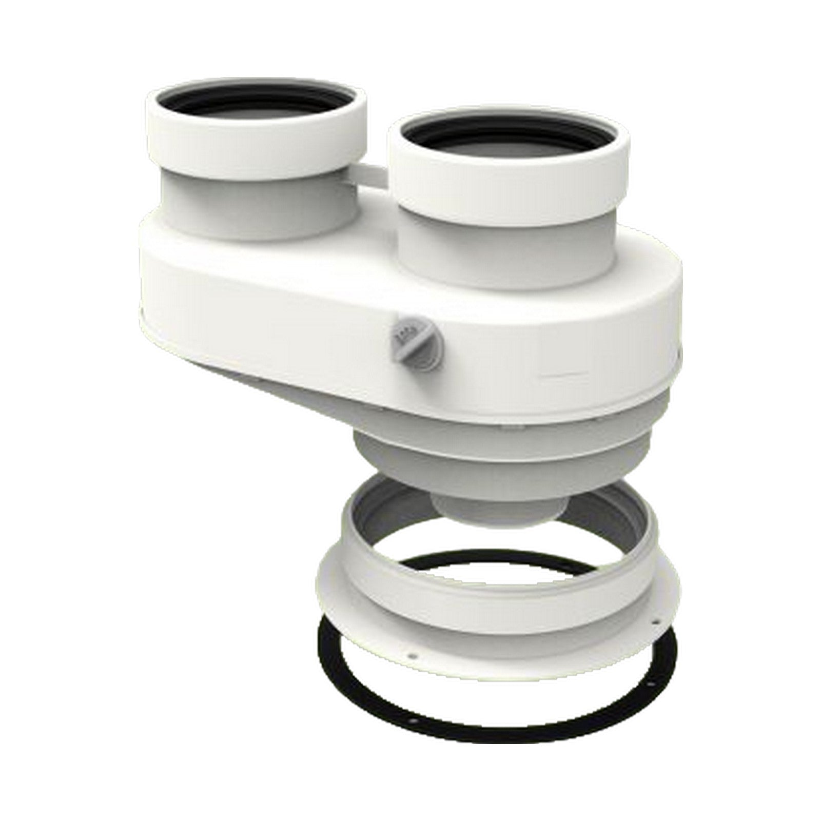 Adattatore uscita caldaia da coassiale a biflusso compatibile con caldaie JUNKERS, REMEHA, VIESSMANN e WOLF realizzato in PP con guarnizioni e rondella.