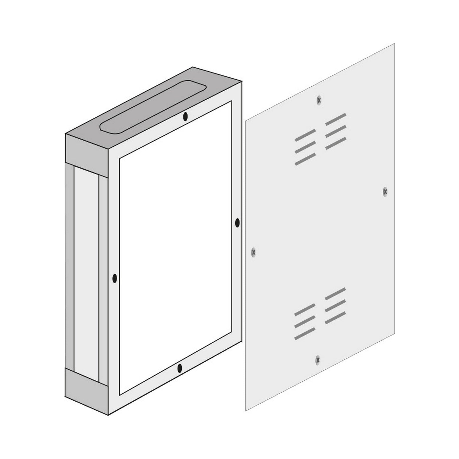 Cassetta per collettori completa di telaio. Fondo e supporto per fissaggio collettori art. 230 e art. 232, art. 232, art. 213 e art. 214. Realizzata in lamiera zincata e verniciata.