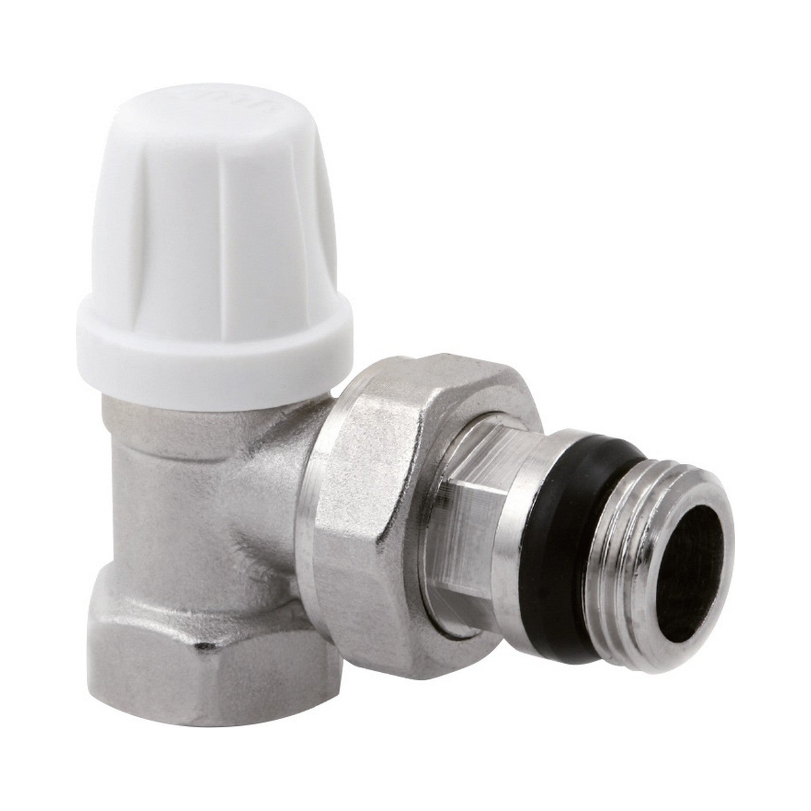 Detentore a squadra micrometrico, per tubo ferro. Doppia tenuta sulla sede, o-ring più tenuta metallica. Corredato di bocchettone antisgocciolamento.